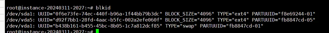 #echo 'UUID="新分区的UUID" 需要挂载的路径 文件系统 defaults 0 0' >> /etc/fstab