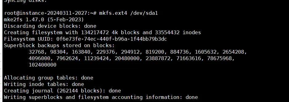 如果是ext4就是执行mkfs.ext4,如果是xfs就是执行mkfs.xfs,这里演示的是ext4文件系统
