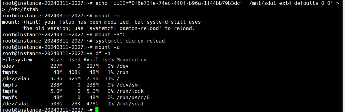 你的磁盘需要挂载到哪个目录上,我这里挂载的是/mnt/sda1目录,你可以挂载到/data目录或者/mnt等目录,一般情况下磁盘都是挂载到/mnt目录下的,这是一个约定俗成的,但并非强制规定。