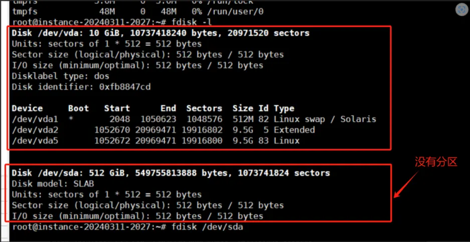 如下图所示,硬盘设备/dev/sda就是没有挂载的 (没有Device Boot Start End Blocks Id System这一栏)