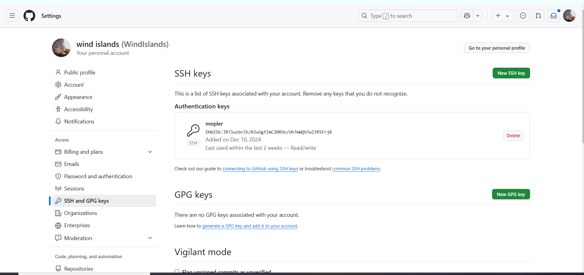 如下图所示,在设置那里,添加一个ssh公钥即可,公钥就是步骤3生成的.pub文件里面的内容。