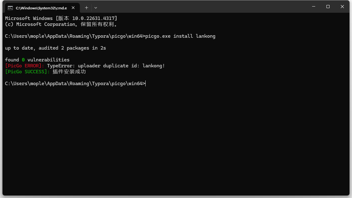 安装兰空图床插件:picgo.exe install lankong(电脑需要先安装nodejs,后续可卸载)