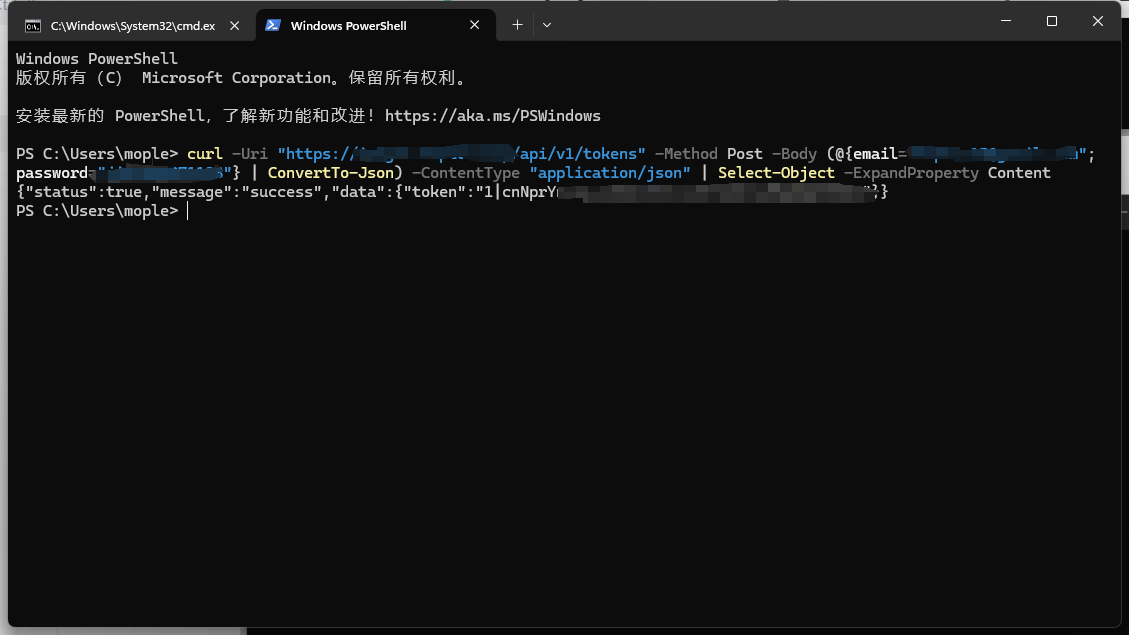 curl -Uri "https://兰空图床地址/api/v1/tokens" -Method Post -Body (@{email="邮箱";password="密码"} | ConvertTo-Json) -ContentType "application/json" | Select-Object -ExpandProperty Content